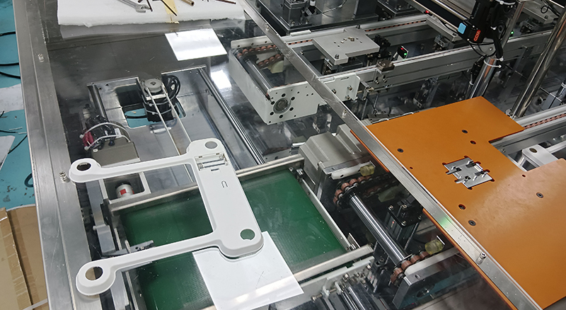 2.2、抓取機構(gòu)將彈片精確地搬運到人體秤工件(通常是裝配有電池盒或PCB板的秤體/底殼)的預(yù)定安裝位置上方。
